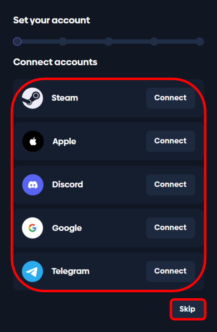 You can connect your account with your already existing Steam, Apple, Discord, Google or Telegram account.